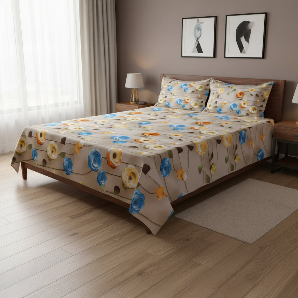 Bring warmth and color into your bedroom with the Amber Bloom Cream Cotton Bedsheet Set. Its lively floral design in vibrant amber, blue, and yellow tones dances gracefully across a creamy beige base, creating a joyful yet elegant atmosphere. Made from 100% heavy glace cotton, this set combines a soft, cotton-like feel with a smooth sheen — perfect for a touch of everyday luxury.