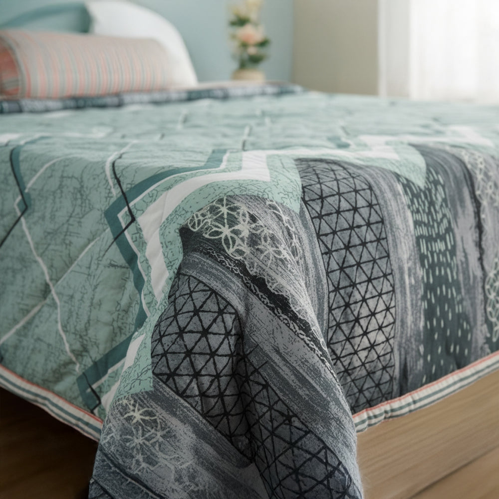 Infuse your bedroom with a refreshing touch of modern calm through the Aqua Haven Reversible Comforter. Featuring a soothing aquamarine base blended with grey and white geometric accents, this comforter embodies a balance of tranquility and contemporary style. Crafted from premium cotton with pure microfibre filling, it delivers a cloud-like softness and all-season comfort. The 3-layer punching technique ensures durability and even insulation, while the reversible design lets you switch between a patterned and minimalist look effortlessly.