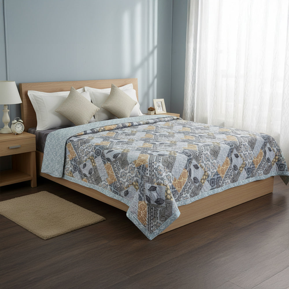 Experience modern artistry and warmth with the Azure Patch Reversible Comforter. Its design showcases an elegant patchwork-inspired pattern blending shades of blue, light gray, white, and muted yellow-tan, offering a sophisticated balance of color and geometry. The reverse side features a delicate blue pattern, giving you two distinct looks in one. Crafted from premium cotton and filled with pure microfibre, this comforter provides year-round comfort and a luxuriously soft touch. The 3-layer punching construction ensures long-lasting loft and even warmth.