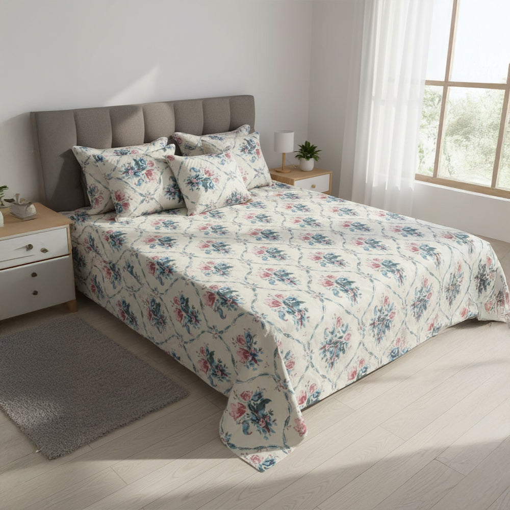 Breathe romance and light into your bedroom with the Blush Haven Floral Cotton Bedsheet Set. Featuring soft watercolor-inspired florals in blush pink and teal blue on an ivory canvas, this design evokes a calm and airy mood. Crafted from premium cotton, it offers a luxuriously smooth touch and enduring comfort — perfect for serene mornings and cozy evenings alike.