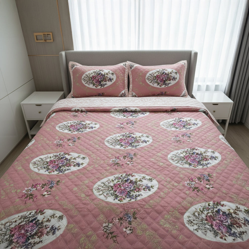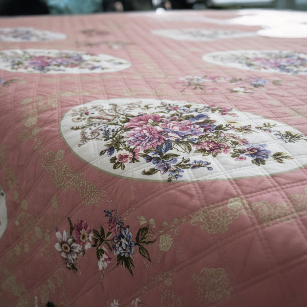 - Design: Elegant floral print on a pink background with fine quilting detail
