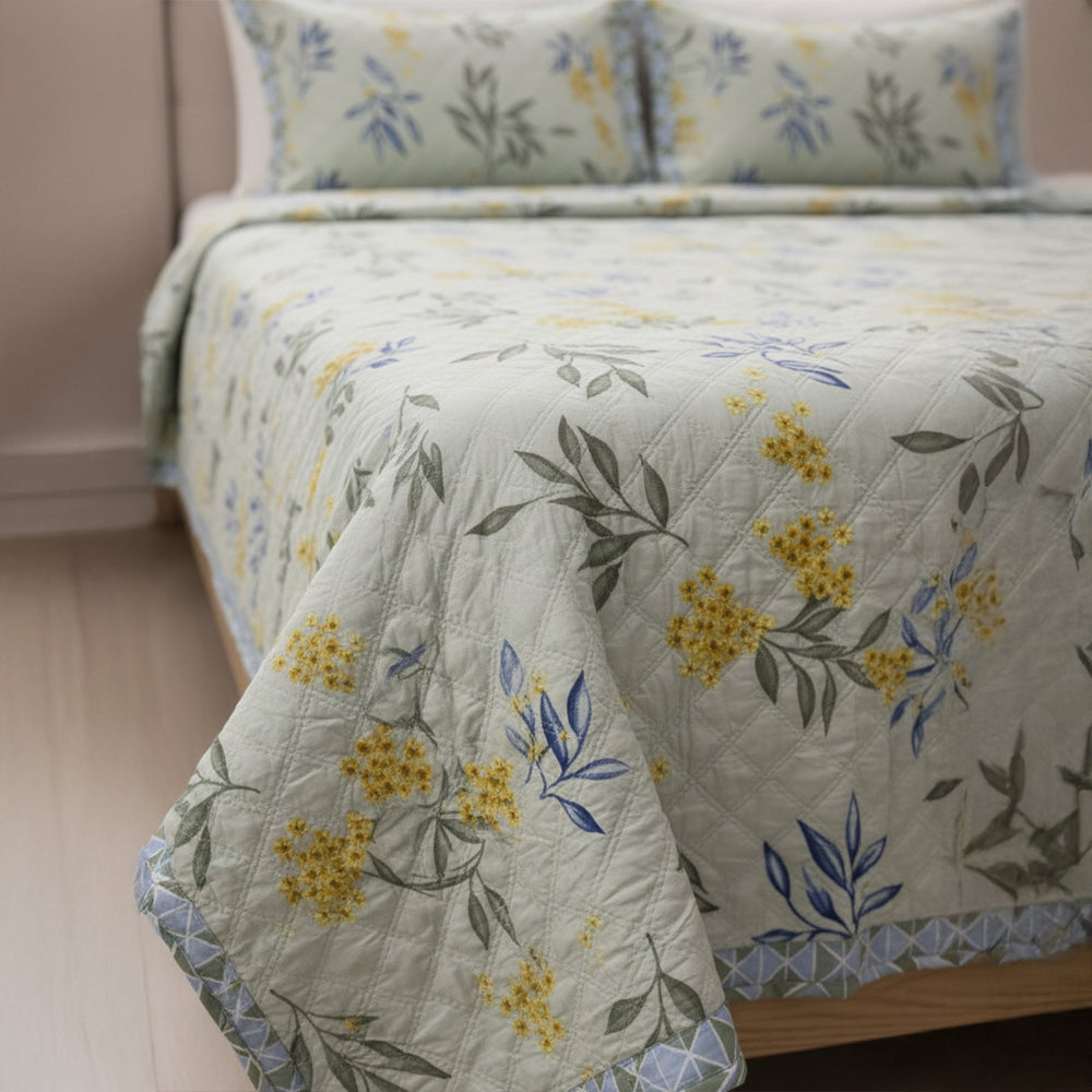 Bring the beauty of nature into your bedroom with this elegant Light Green Floral Quilted Bed Cover Set. Featuring a soothing green base adorned with delicate yellow and blue floral patterns, this piece effortlessly blends freshness and comfort. Made from 100% pure cotton, it is super soft, breathable, and completely quilted for a plush, cozy feel. Designed for versatility, it can be used as a bed cover, comforter, quilt, or bedsheet, making it an all-season essential for your home.