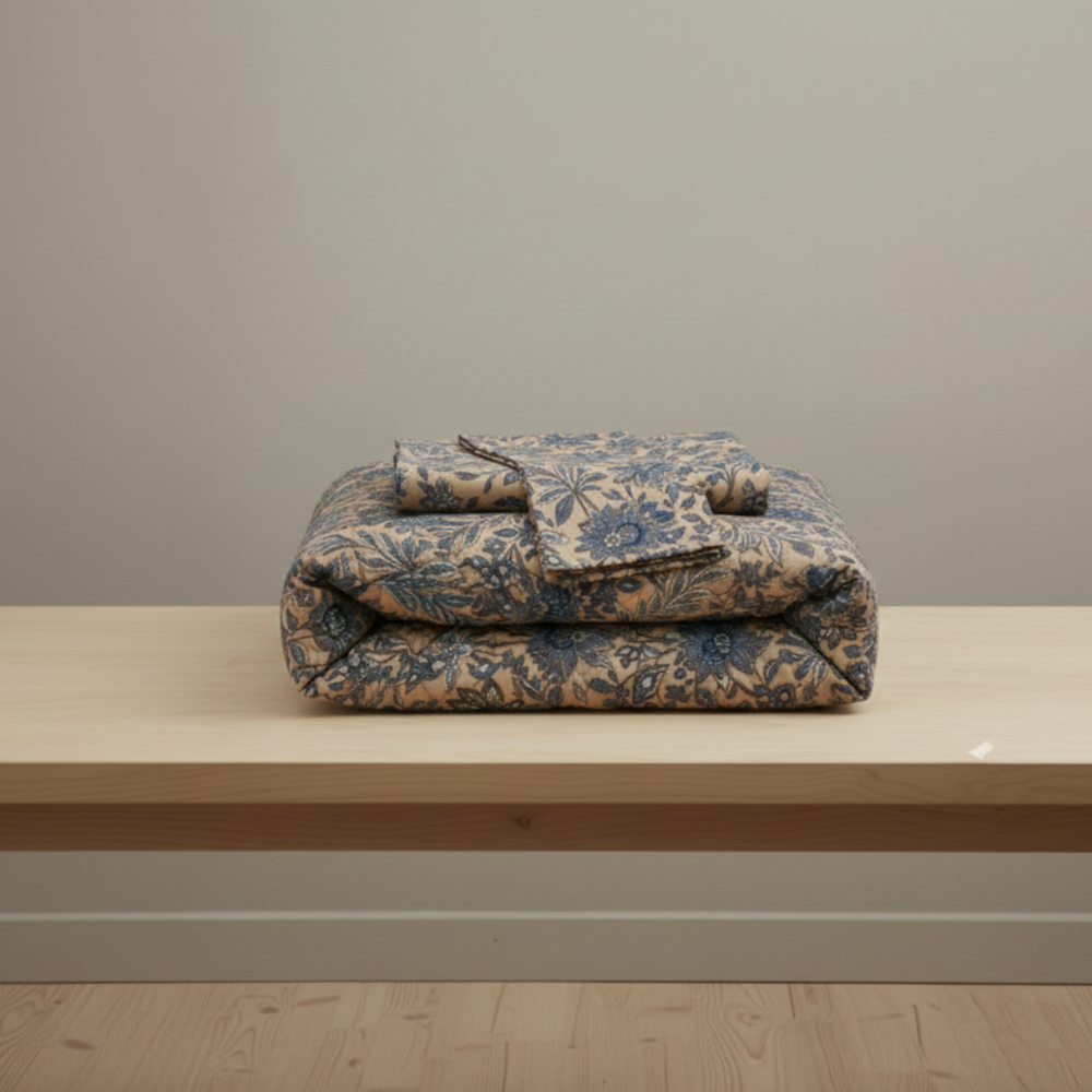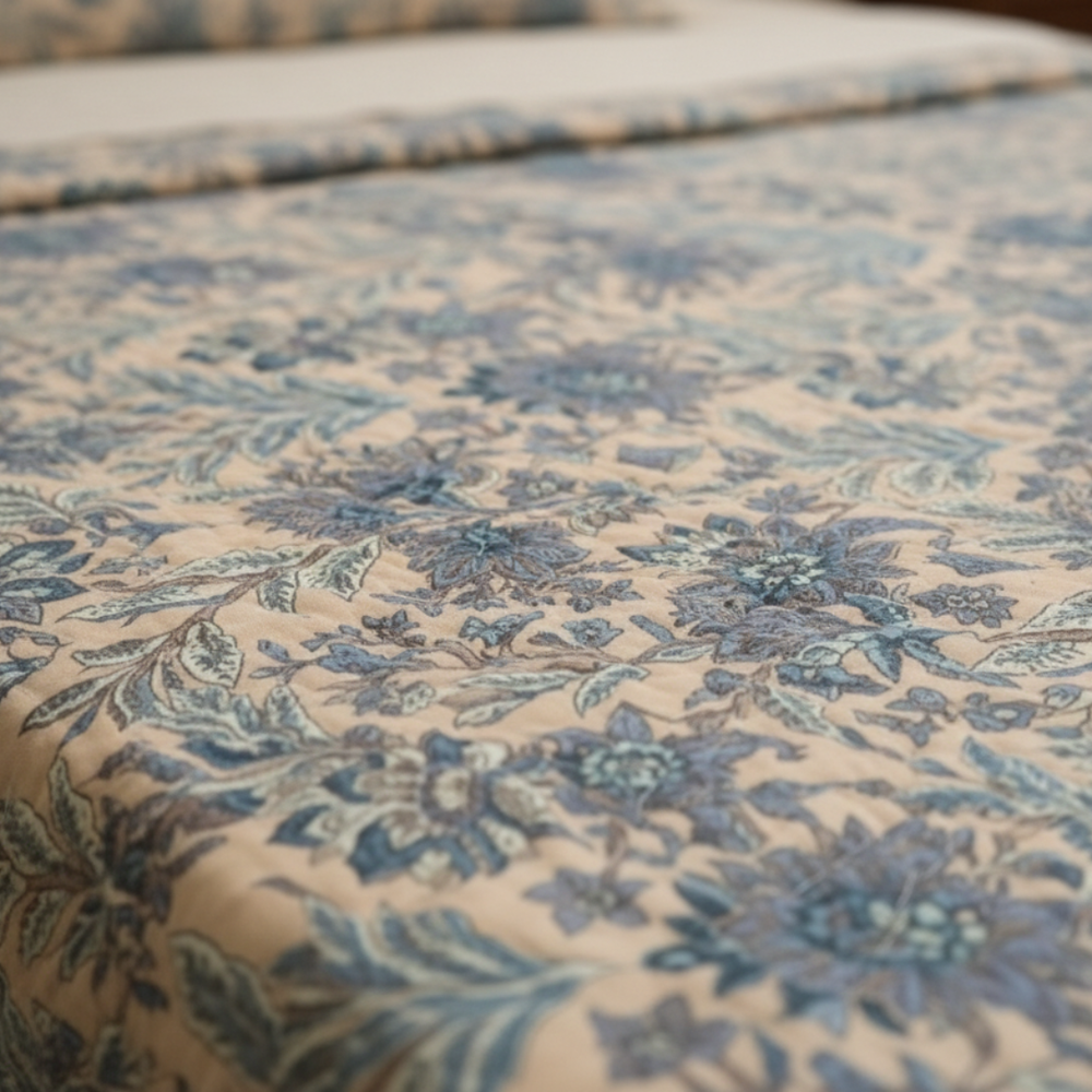 Crafted from high-quality cotton, the fabric feels soft on the skin and remains breathable for year-round comfort. The comforter provides cozy warmth, while the matching queen-size bedsheet and pillow covers complete the look seamlessly. Each piece is manually finished with superfine craftsmanship, ensuring durability and a refined appearance.