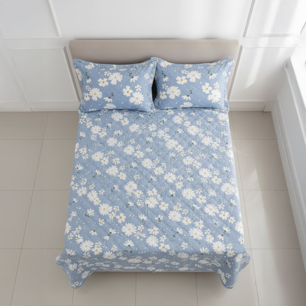 Bring a fresh, floral charm to your bedroom with this light blue daisy quilted bed cover set. Crafted from 100% pure cotton, this set combines softness, durability, and elegance in one. The cheerful white daisy print against a serene blue base adds a calming, springtime feel to your space. Designed for multipurpose use, it can be used as a bed cover, lightweight comforter, bedsheet, or quilt, giving you year-round comfort.